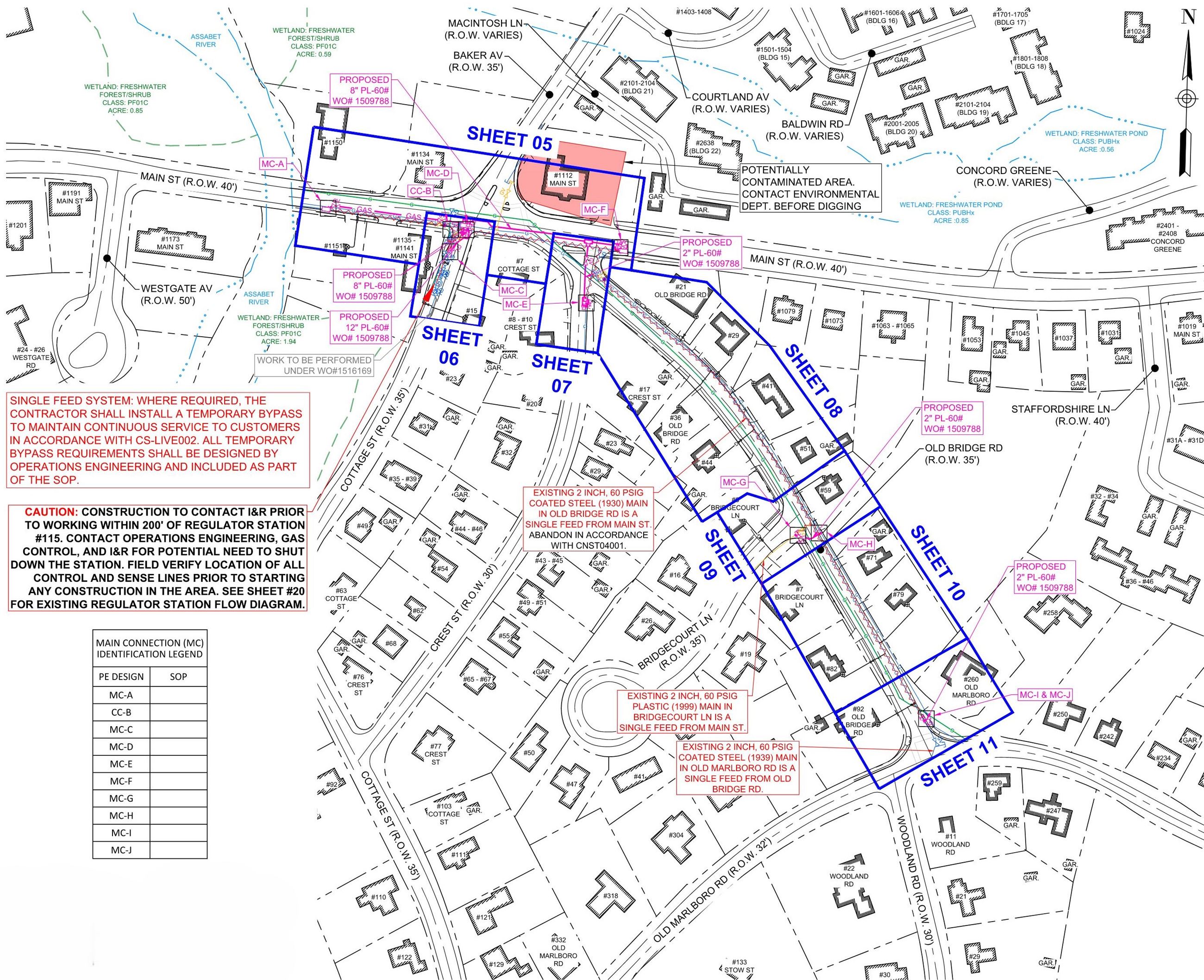- Part of the project also includes replacing multiple sections of gas mains on Main Street, Cottage Street, Old Bridge Road, Crest Street, and Bridgecourt Lane, and the removal of the National Grid regulator station on Cottage Street. Overall gas main replacement plan.